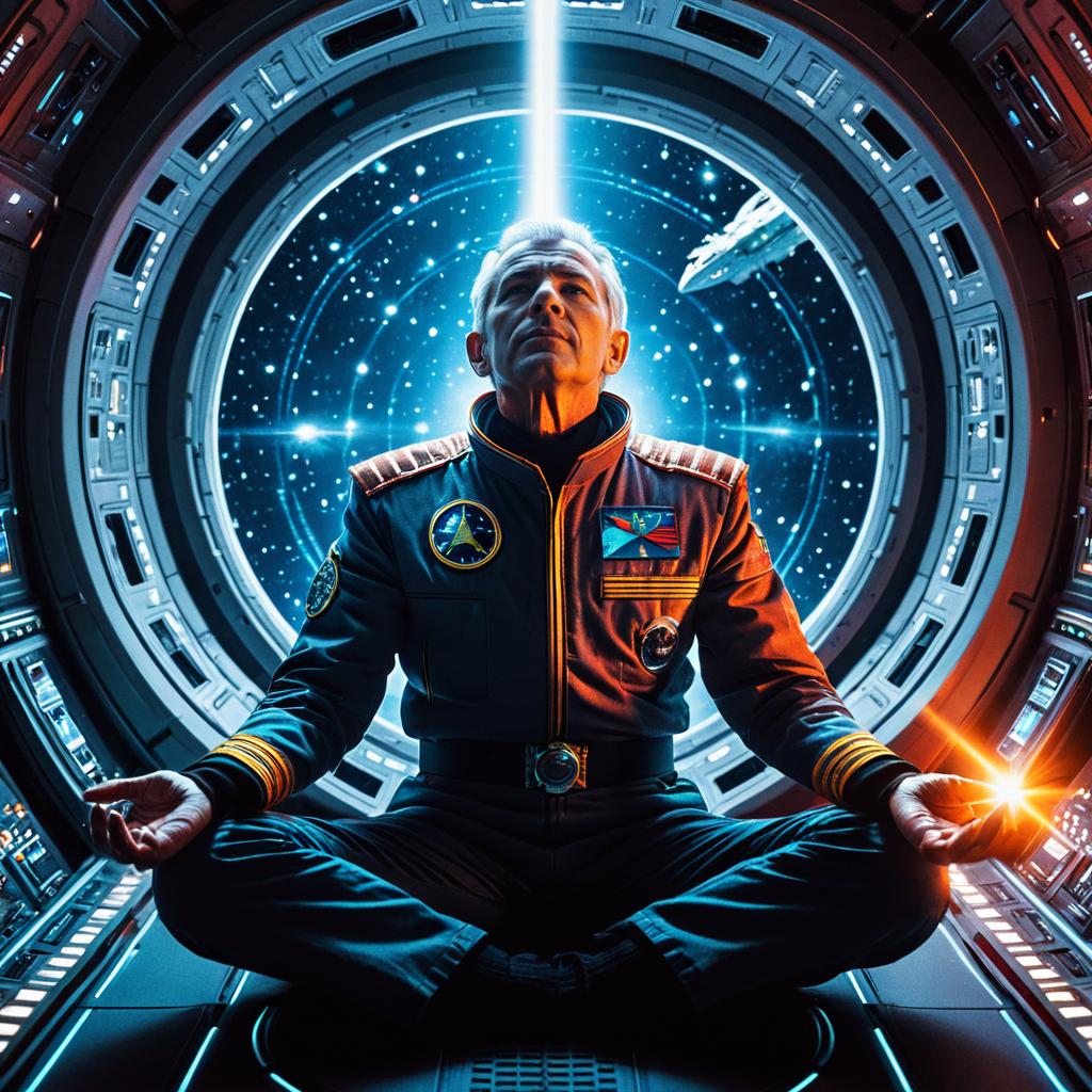 Portrait of a senior male starship captain meditating inside a futuristic spacecraft corridor or tunnel, with a glowing neon flare and starry space background visible through a circular window behind him. The captain wears a detailed blue uniform with patches and insignia, sitting cross-legged and calm, surrounded by sci-fi elements and lighting.