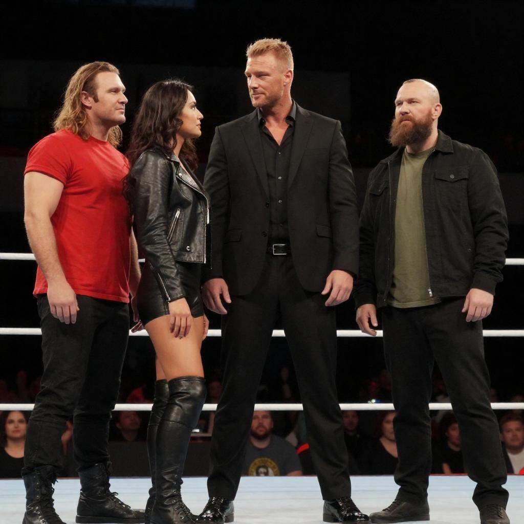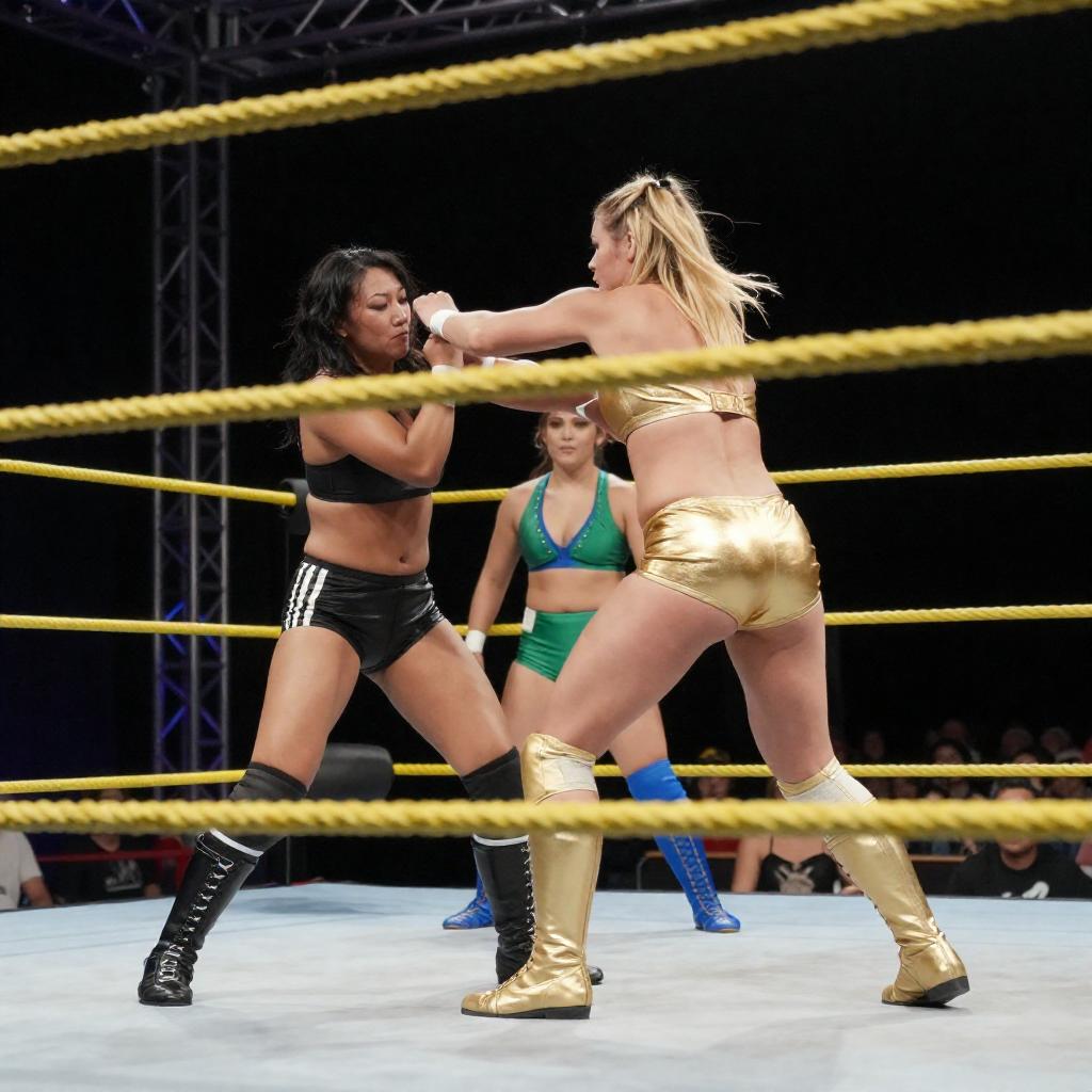 Photograph of a wrestling match: three people stand in a ring, arms raised in victory. A shirtless man with blond hair and gold trunks is on the right, a man in a white shirt and black pants is in the center, and a woman with black hair and black shorts is on the left. Red ropes and a dimly lit background are visible.