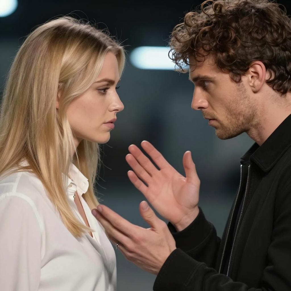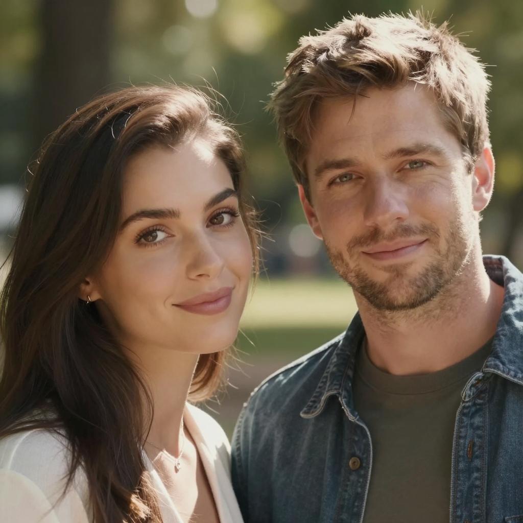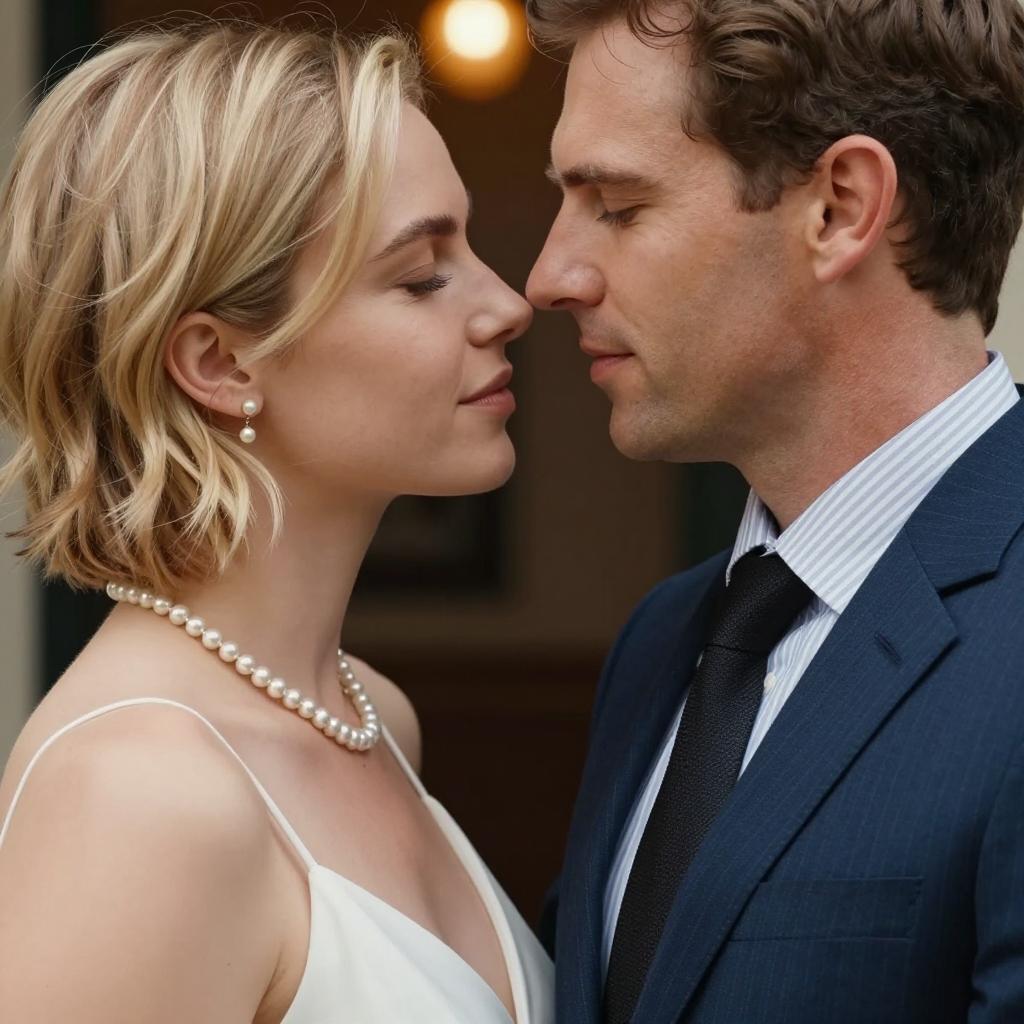 A man and woman in a convertible car. Man with dark brown hair, gray suit, white shirt, dark tie, leaning toward woman, left hand on her shoulder. Woman with long blonde hair, red coat with gold buttons, right hand holding coat edge. Green forest background. Man looks at woman with soft expression. Woman looks at man, slight smile. Both seated, car interior visible. Forest trees in background.