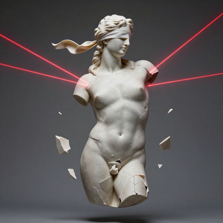 Muted shattered fragments of greek torso suspended in the air, wearing blindfold, several bright red lasers bouncing towards and away the statue, ultra resolution, 8k,
