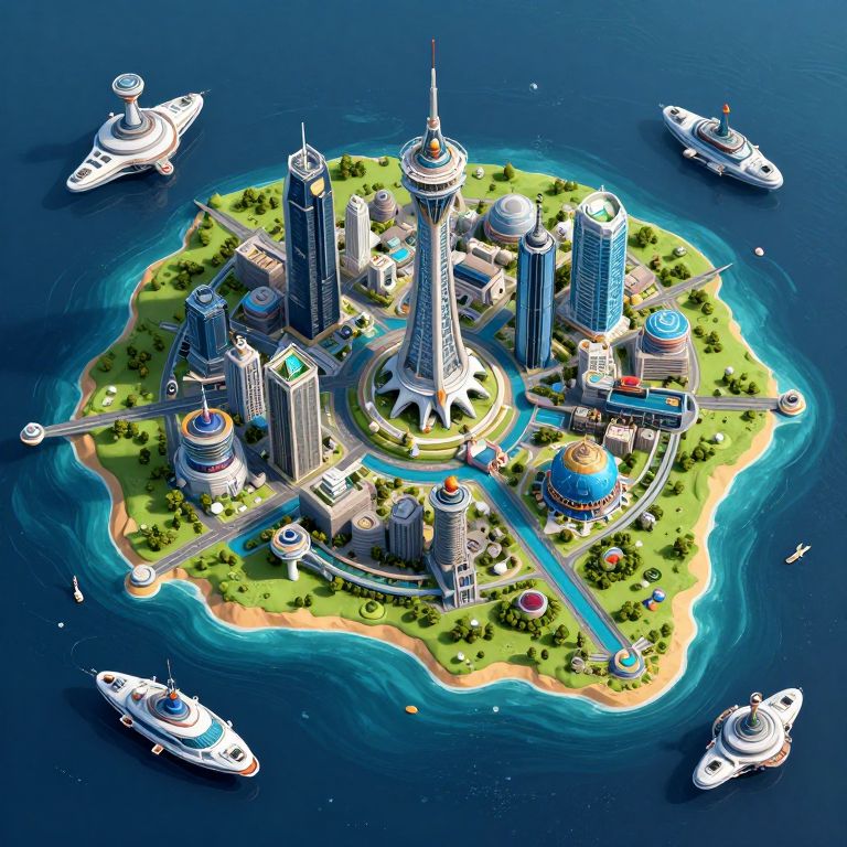 Digital art of a small island with futuristic skyscrapers, surrounded by blue water, with five white yachts circling. Vibrant colors, detailed