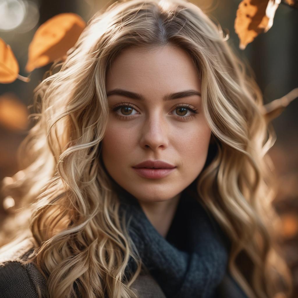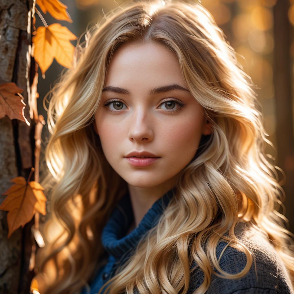 A realistic portrait of a young woman with long wavy blonde hair and subtle freckles, natural warm lighting in an outdoor autumn setting, soft focus, cinematic glow highlighting her face, surrounded by tree bark and dry brown leaves