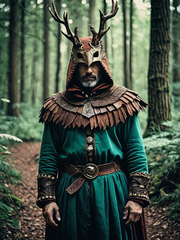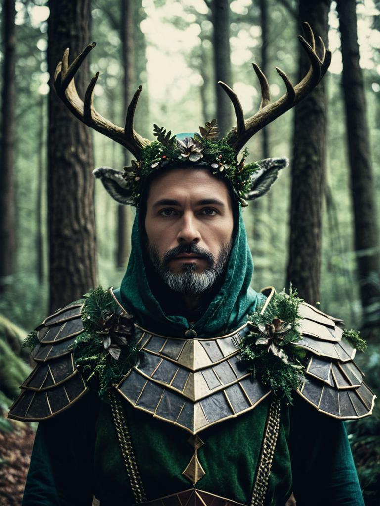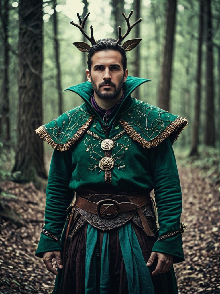 A man dressed in an elaborate enchanted forest-themed costume featuring a dark green cloak, detailed embroidery, leather belt, and metal gauntlets. He wears a headpiece with antlers and shoulder decorations made of brown leaves. The photo is taken waist-up in a dense, green forest setting, giving the image a mystical and fantasy-like tone.