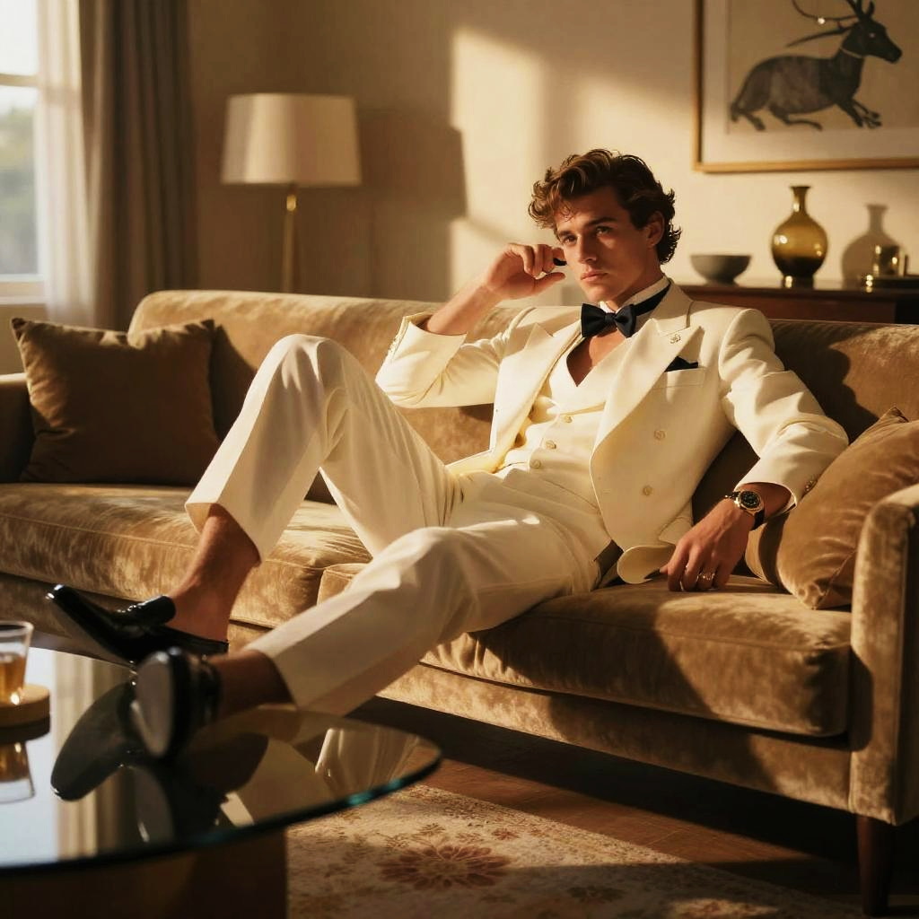 Playboy young man in stylish vintage attire, lounging in a luxurious mid-century modern living room, golden hour sunlight casting warm tones, cinematic lighting