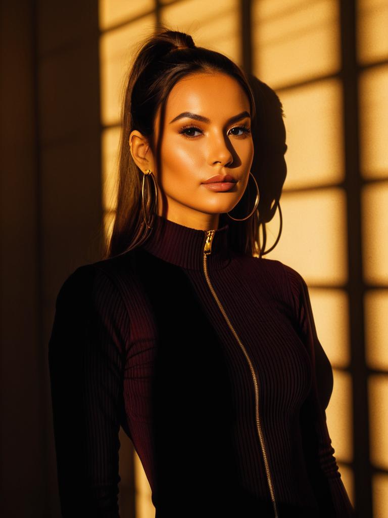 Portrait of a young woman wearing a fitted, ribbed, long-sleeve bodycon dress in dark blue. She has a sleek high ponytail and large hoop earrings, standing against a dark background with dramatic lighting casting shadows.