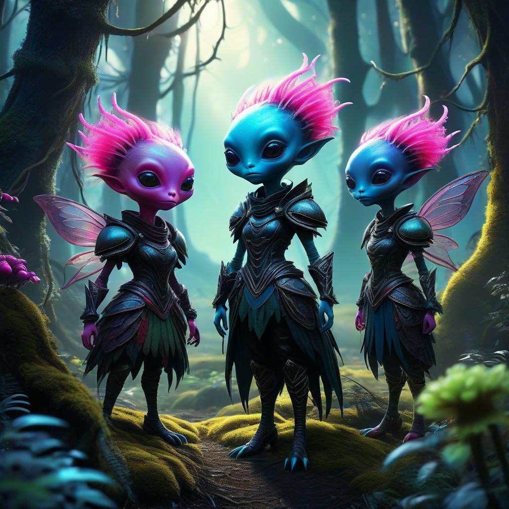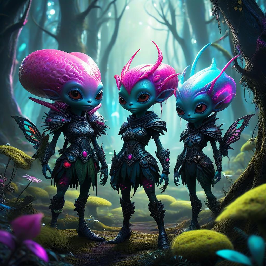 Fantasy tough alien chicks in an enchanted forest, everyone armed, dark fantasy fairy tale style, vibrant nature-inspired design