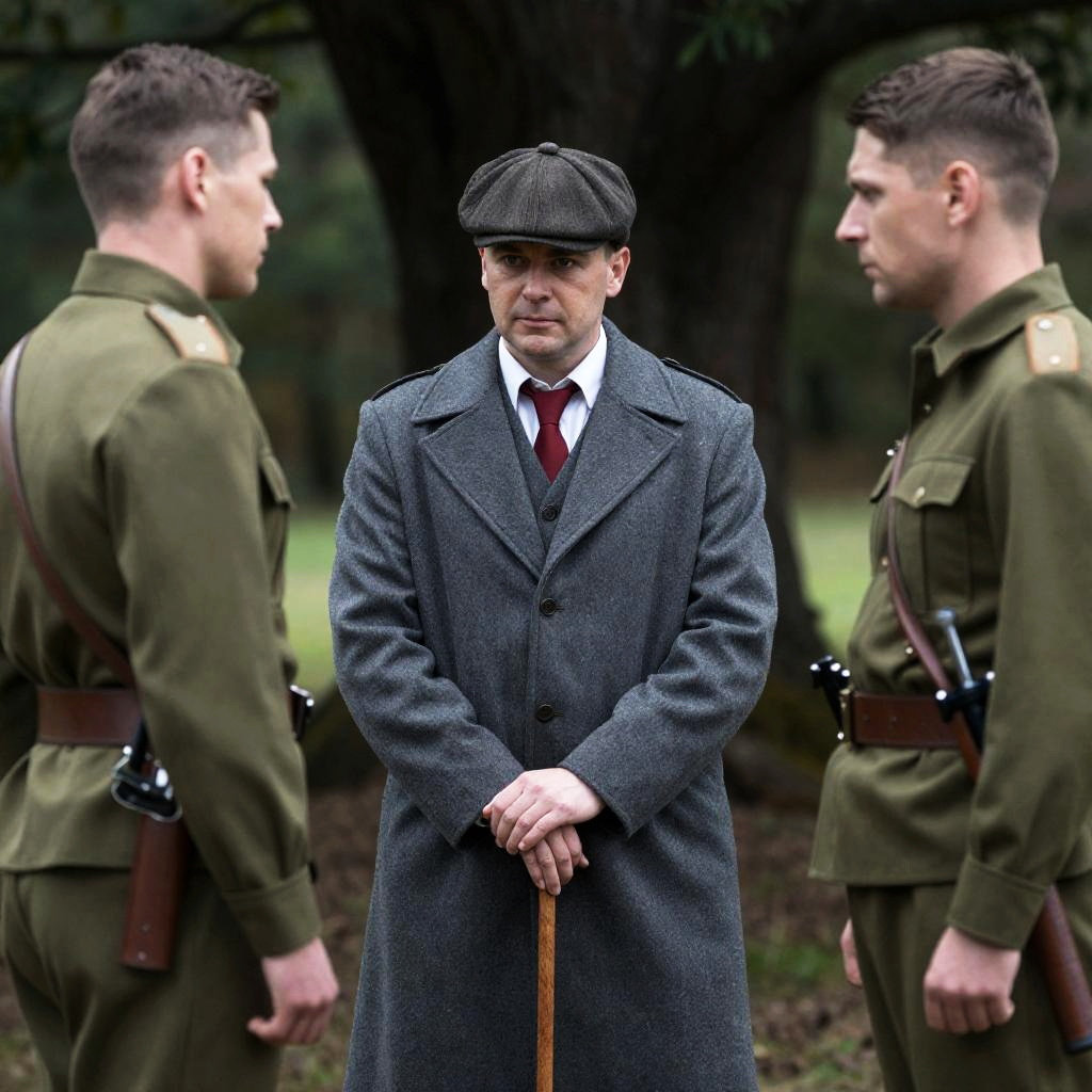 Photograph of two men in a dark, industrial setting. Foreground man with brown coat, gloves, and rifle, intense gaze. Background man with disheveled hair, focused expression. Other men in brown coats, standing and walking. Smoke, dim light, brick walls, tunnel entrance. One man with rifle in background.