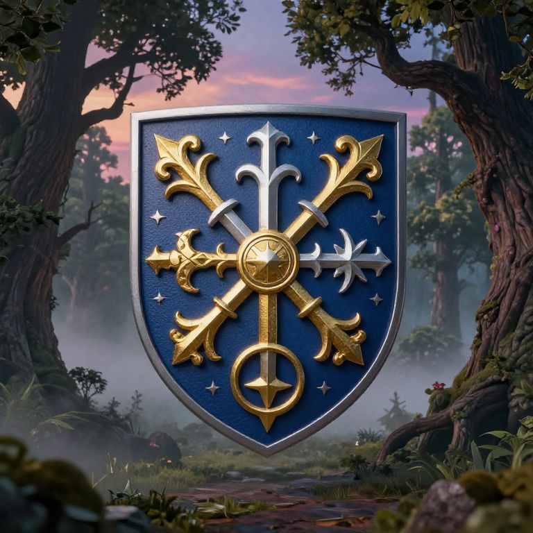 Free coat of arms floating in a misty medieval forest, intricate heraldic symbols shining with gold and silver accents, surrounded by ancient oak trees under a twilight sky, fantasy style, highly detailed, vibrant colors.