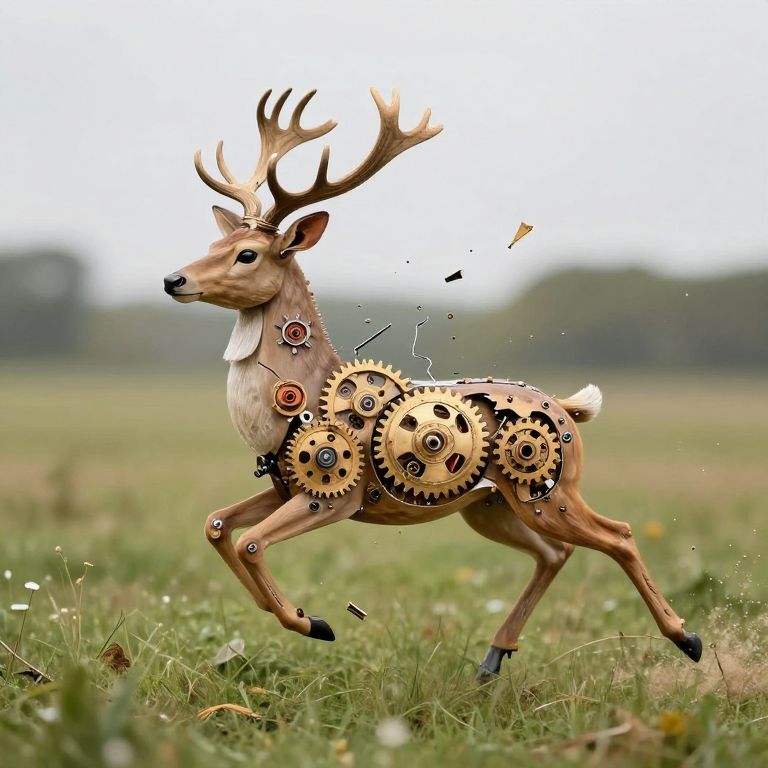 Digital artwork of a deer with gears and clockwork mechanisms, running through a grassy field, with blurred forest background.