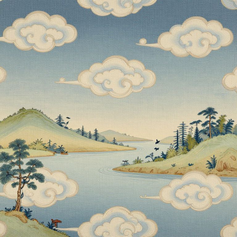 Sound Effects clouds, water, chinoiserie, in the style of schumacher, fairytale landscape, textile pattern,