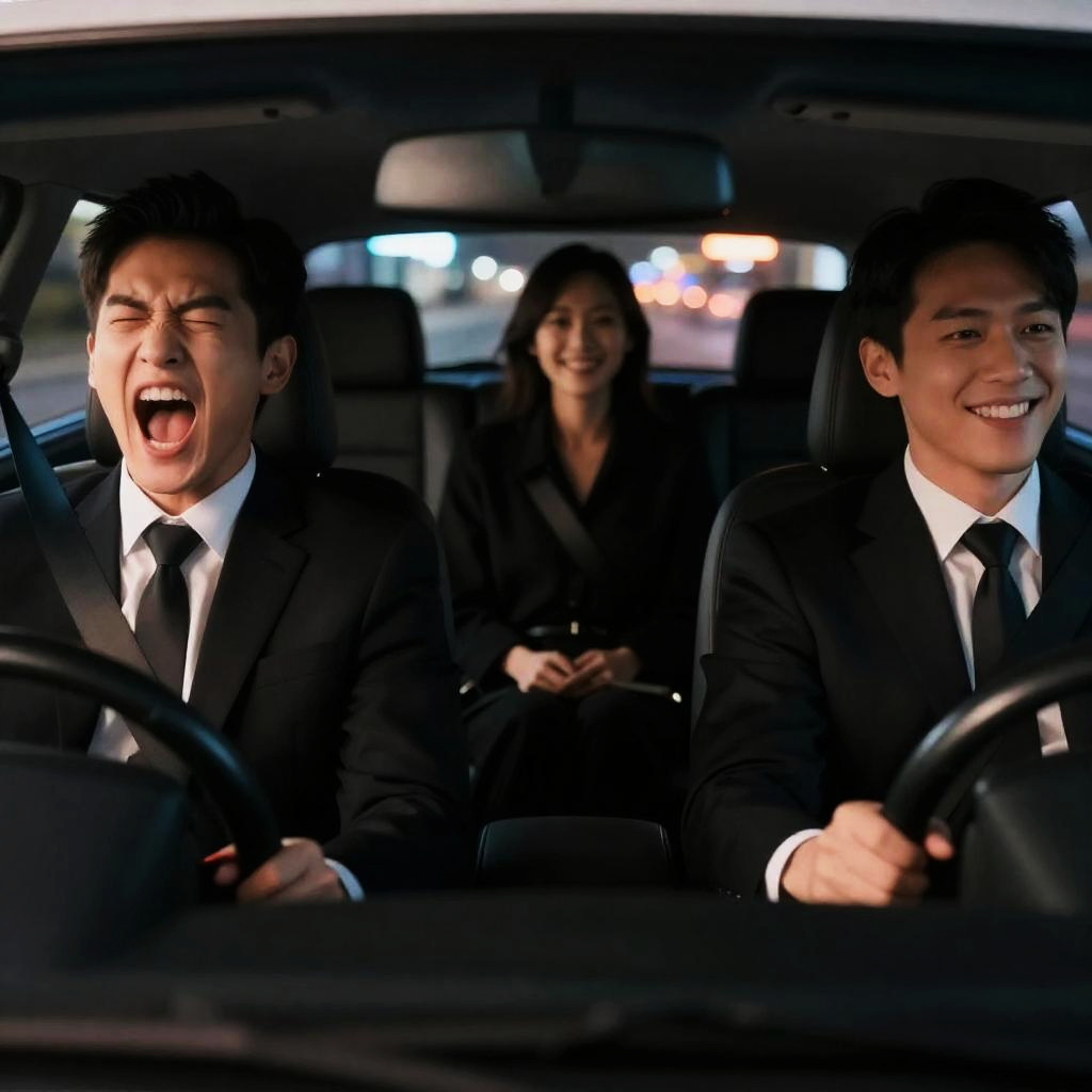 Photograph of three people in a car at night. Two men in black suits and ties, one yelling with mouth open, one smiling, and a woman in a black coat, seated in the back. Neon city lights in the background. Car interior visible, steering wheel in foreground.