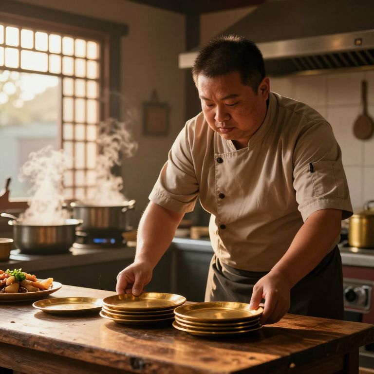 Photograph of a focused Asian male chef in a beige uniform, stacking golden plates on a wooden kitchen counter with steaming pots in the background. Warm