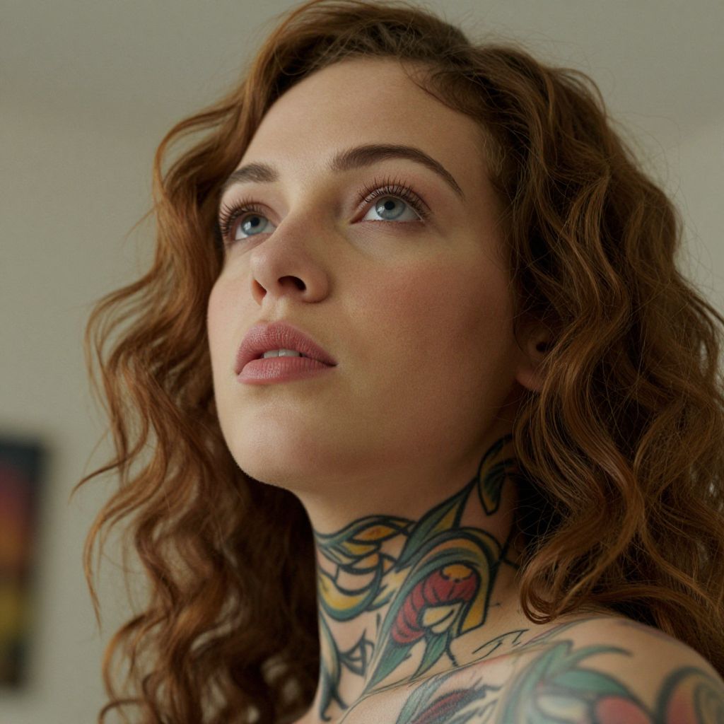 Imagine an intimate close-up portrait capturing the enigmatic gaze of a Caribbean woman with dreamy blue eyes, her expression a study in contrasts - serene yet hinting at untold stories. Her porcelain skin and wavy chestnut hair provide a striking foil to the vibrant tattoos adorning her neck and shoulders, each design a narrative in its own right. From a unique low-angle perspective, as if looking up at her, the viewer is drawn into the depths of her eyes, where subtle emotions play out, shifting between confidence and a hint of melancholy. The environment softens into a gentle blur, allowing only the ethereal beauty of this tattooed muse to remain in crisp focus. This portrait invites viewers to delve into the layers of her soul, merging the art of body ink with advanced digital photography techniques.