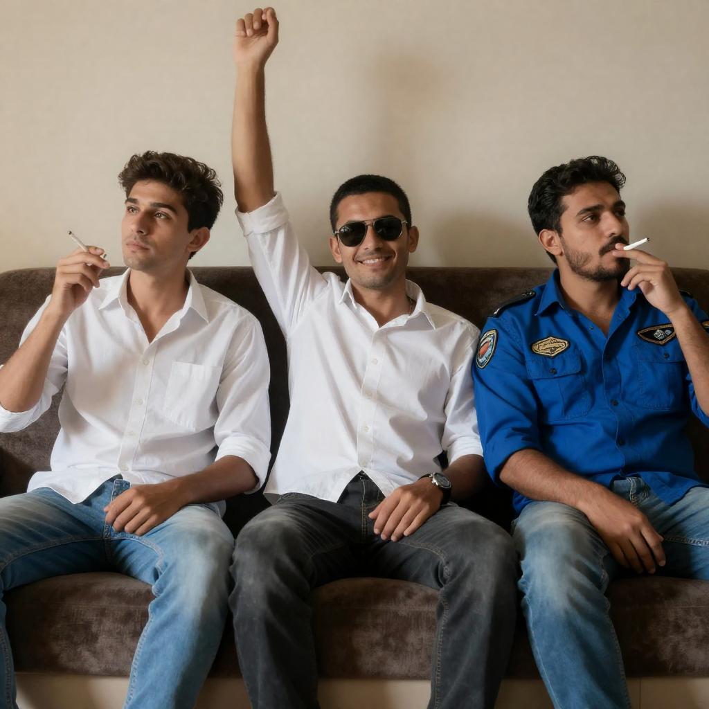 Photograph of a young man with short dark hair, wearing a green t-shirt, smiling while smoking a cigarette. His right hand holds the cigarette near his mouth. Background is dimly lit with red and green light. Blurred people in the background. He leans forward, facing another person with dark hair in the foreground.