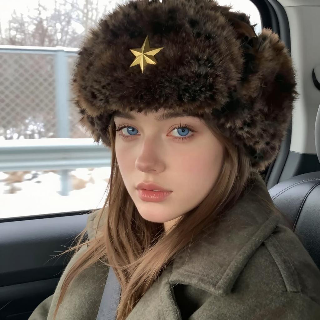 Close-up photograph of a young woman with fair skin and blue eyes, wearing a dark brown fur hat with a gold star-shaped emblem. She has light brown hair peeking out from under the hat, wearing a greenish-brown coat. A seatbelt is visible on her right side. The background is a blurred chain-link fence with a metallic structure behind it.