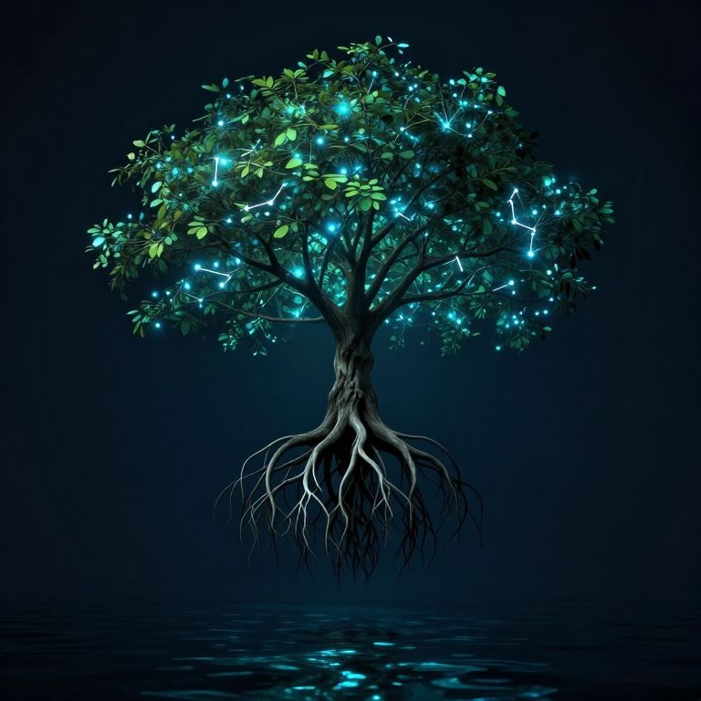 A surreal digital artwork depicts a solitary tree growing upside-down from the ocean's surface, its intricate roots forming a luminous canopy adorned with bioluminescent leaves that cast ethereal constellations upon the dark, reflective waters below, evoking a mystical and otherworldly atmosphere.