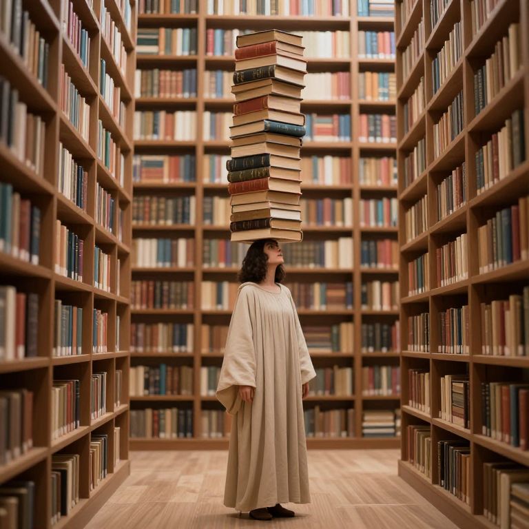 In a surreal, computer-generated scene, a figure clad in a flowing beige robe stands amidst towering bookshelves, balancing a precarious stack of gravity-defying books atop their head, evoking a whimsical blend of fantasy and digital artistry.