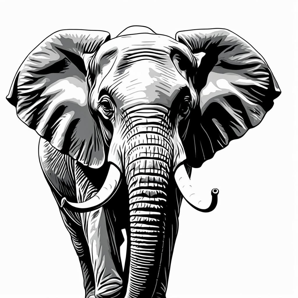Black and white minimalist line art illustration of an elephant head and upper body featuring intricate details and shading in a monochromatic style.