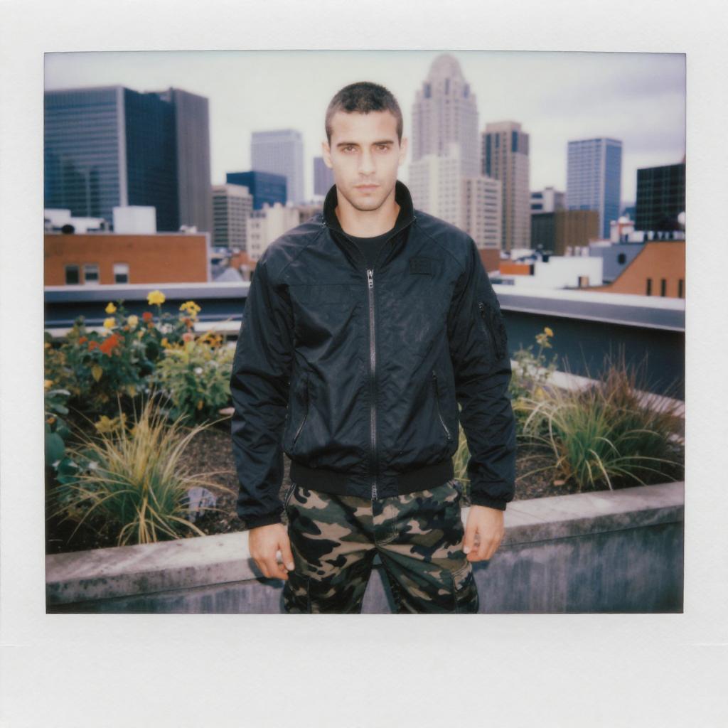 Photograph of a young man with short, dark hair and fair skin, standing against a cityscape background. He is wearing a black zip-up jacket over a black shirt and camouflage patterned pants. His expression is neutral, and he stands with his hands by his sides. Behind him, there is a rooftop garden with grasses and small flowers, and tall, modern skyscrapers rise in the distance under a cloudy sky. The image has a white border and a slightly overexposed, vibrant color palette.
