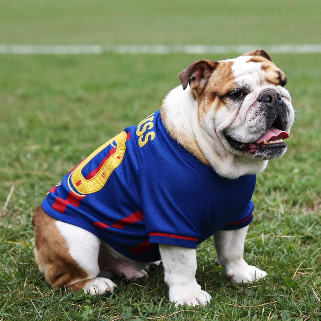 Happy Bulldog in Messi Dog Jersey
