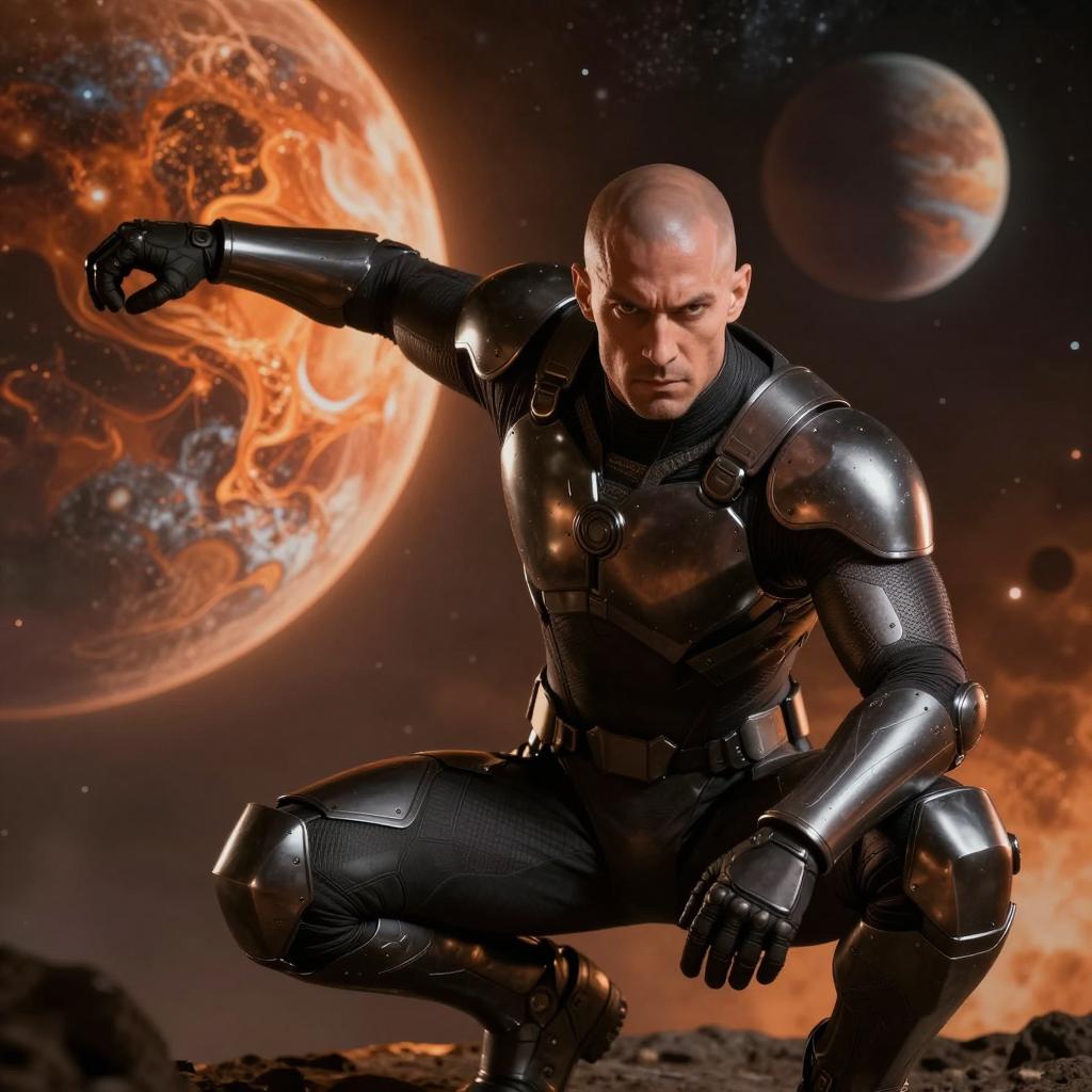 Sci-fi soldier in metallic armor with a reflective helmet and visor, standing in a smoky, fire-lit environment. Dark, industrial background. Flames on the left. Soldier's expression is intense and focused.