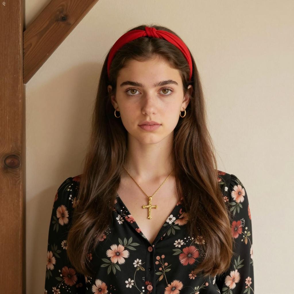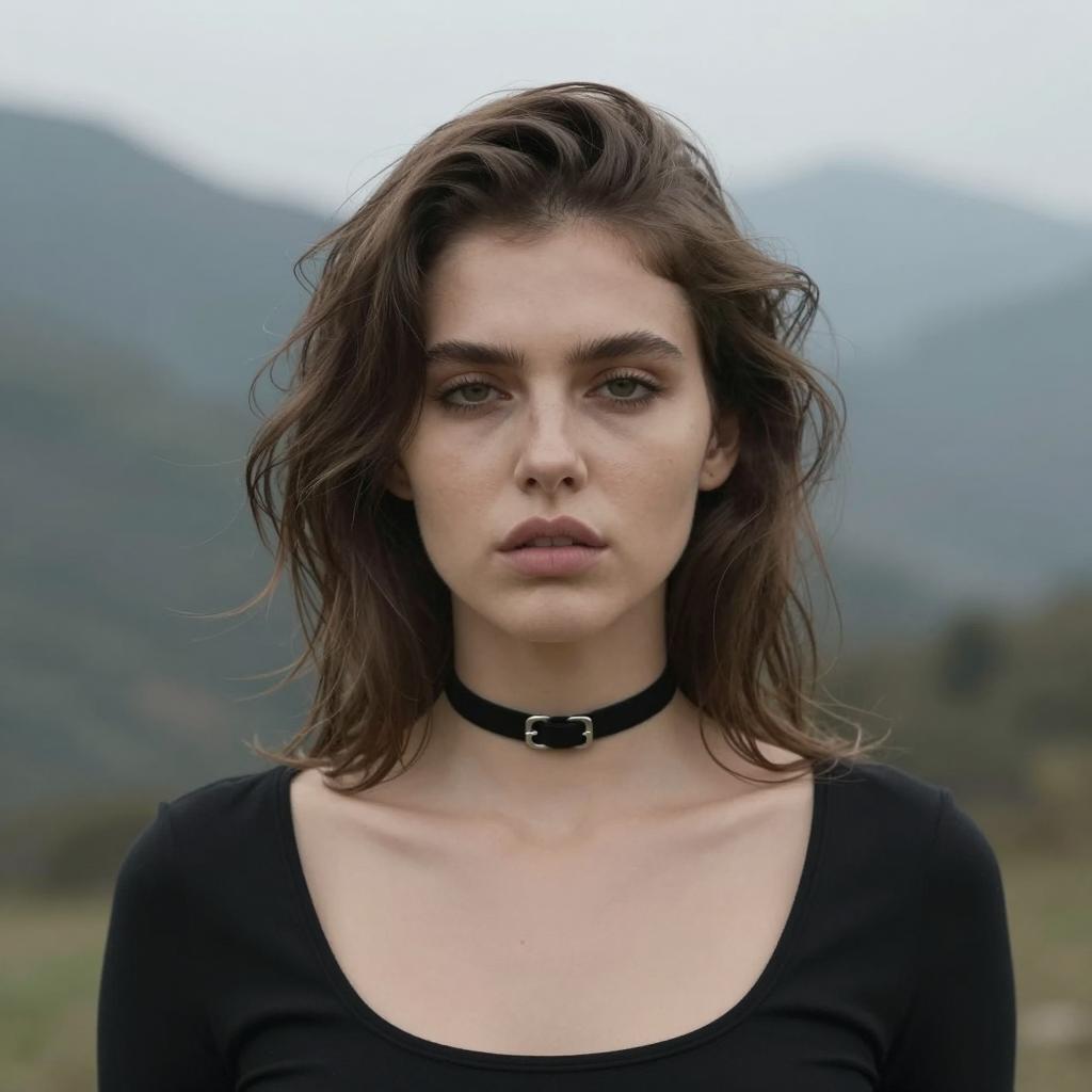 Close-up of a young woman with fair skin, dark brown wavy hair, and brown eyes. She wears a white lace veil, a white choker, and a white lace-trimmed dress. Green foliage and blurred hills in the background. Her expression is neutral with slightly parted lips. The lighting is natural.