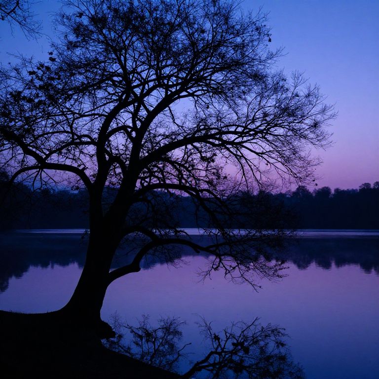 Silhouette of tree with sprawling branches and sparse leaves, reflected perfectly on a still lake at twilight, deep blues and purples dominate the scene, peaceful and meditative vibe, ultra detailed nature landscape, painterly texture