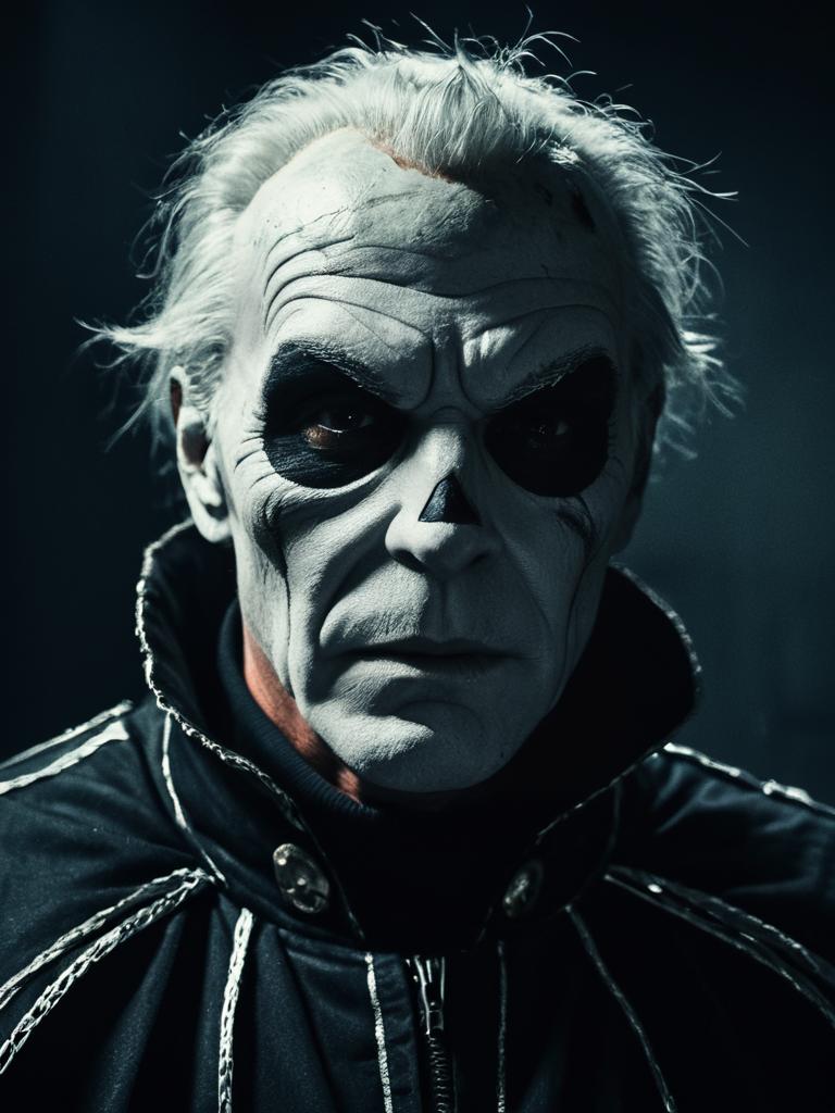 Portrait of a man wearing detailed skull makeup on his face, dressed in a dark hooded jacket. The image has a cinematic and realistic style, highlighting the sharp facial features and intense expression of the subject in a low-lit environment.
