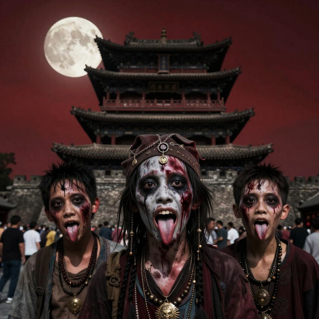((realistic))), ((masterpiece), (best quality), ultra high res, (raw photo:1.2), (photorealistic:1.4), Exceptional detail, dramatic lighting, highres, 8k, absurdres, red dark sky, full moon, ancient Chinese building, Chinese tower, 3boy, ((Chinese_Qing_zombie:1.3), Zombie_hat, (closeup:1.5), jewelry, crowd of people, tongue out, (awaitingtongue:0.6)