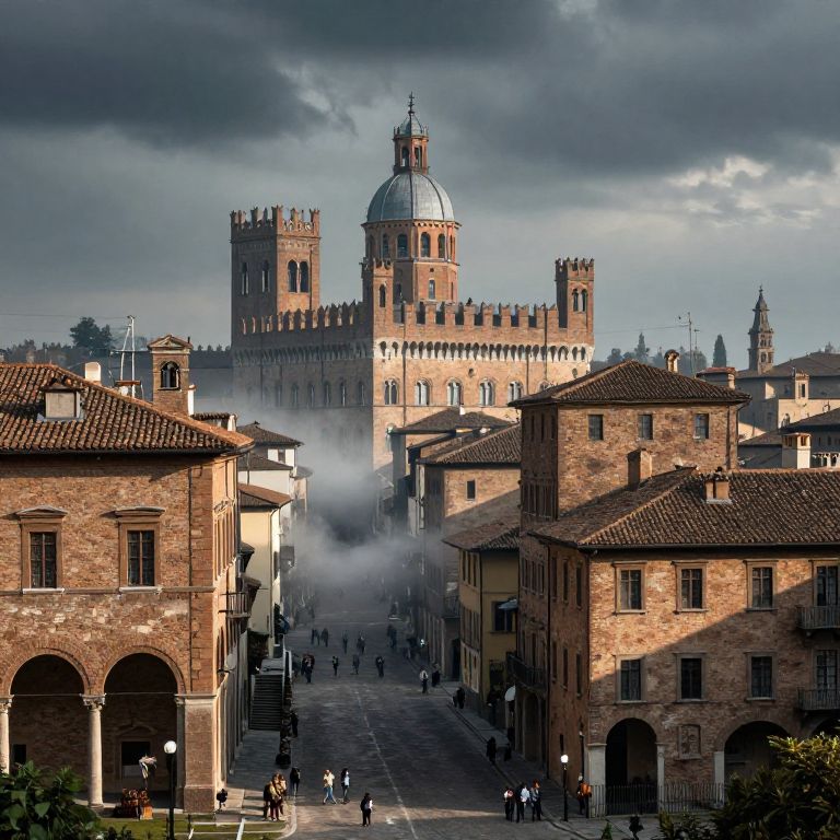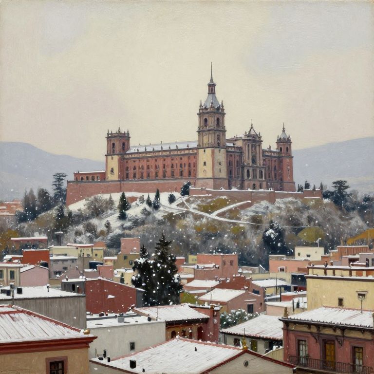This is a digital painting of a snow-covered, historic castle perched on a hill, surrounded by a small town. The castle has multiple towers, ornate architecture, and a reddish-brown hue. Snow lightly covers the roofs of the town's buildings, which are in various pastel colors like beige, pink, and red. Tall evergreen trees dot the hillside. The sky is a pale blue with a few white clouds. The foreground shows a cluster of buildings with red and white roofs, while the background features the majestic castle and distant, blue-tinged mountains. The painting style is realistic with a slightly whimsical touch.