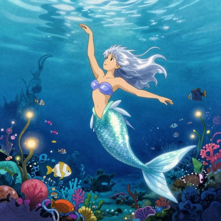 Visualize an underwater haven where vibrant aquatic life flourishes in harmony with ethereal elements reminiscent of James Gurney's vivid watercolors and the enchanting animation of Hayao Miyazaki's films. A captivating mermaid with scales that gleam like moonlight gracefully performs a mesmerizing dance, her hair flowing like liquid silver amidst glowing flora. The perspective from a school of fish swimming alongside her offers an intimate view, evoking both wonder and serenity as fantasy and natural beauty merge into a captivating realm where magic seamlessly blends with reality.