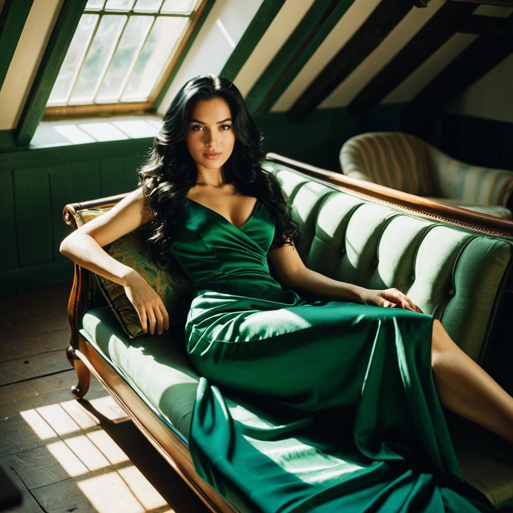 A stunning woman with long wavy black hair and smooth skin reclines elegantly on a vintage chaise lounge in a sunlit attic. She is wearing a shimmering halter maxi dress covered in sequins. Warm natural light filters through attic windows creating soft shadows and highlighting her soft makeup and full lips.