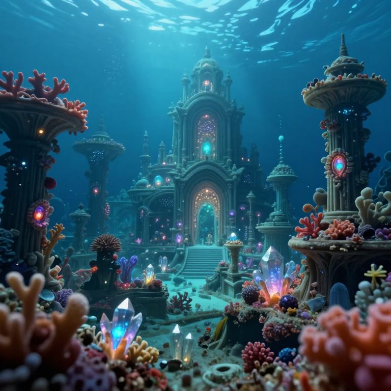 Craft an enigmatic seascape where luminous marine life illuminates an ancient submerged metropolis in the vein of surrealistic artistry. Observe this scene from a diminutive perspective akin to a microscopic creature's viewpoint, highlighting intricate details of otherworldly architecture adorned with coral-like formations and radiant crystals. Emphasize vivid hues and fluid forms to instill an ethereal ambiance, merging dreamlike components with the majesty of ruins that have endured for eons beneath the enigmatic sway of cosmic waters.