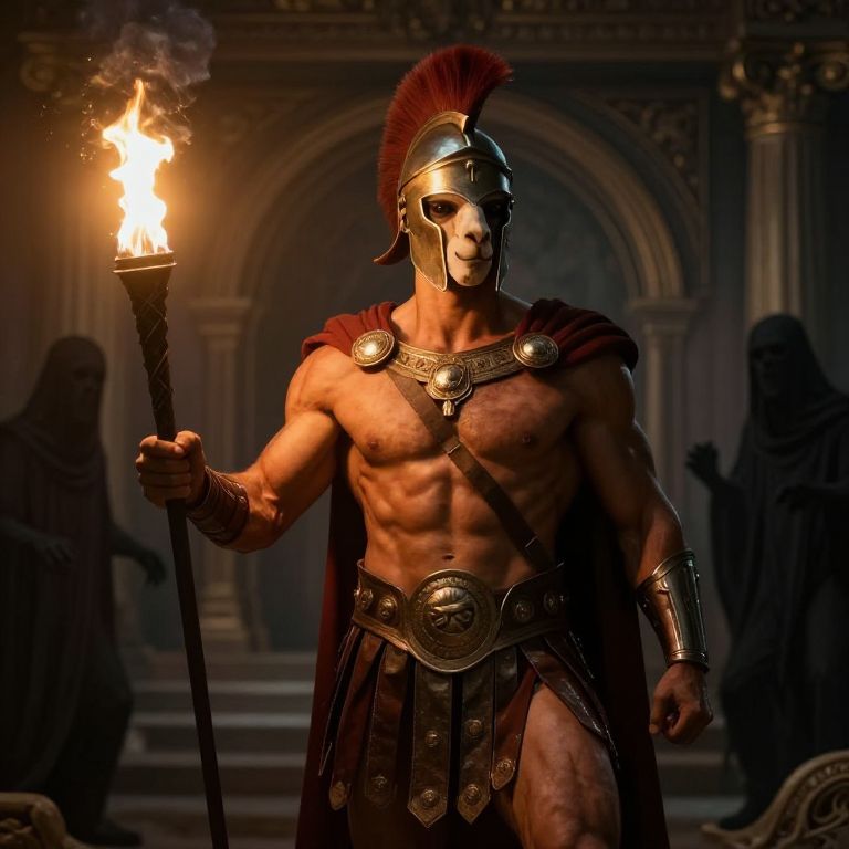 Photograph of a muscular, shirtless gladiator with a metallic helmet and plume, standing in a sunlit field of yellow flowers, with two