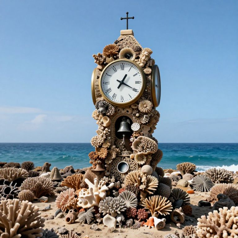 A clocktower grows organically from a coral reef, its ticking chimes synced with the pulse of the ocean, measuring time in tides and lunar phases.