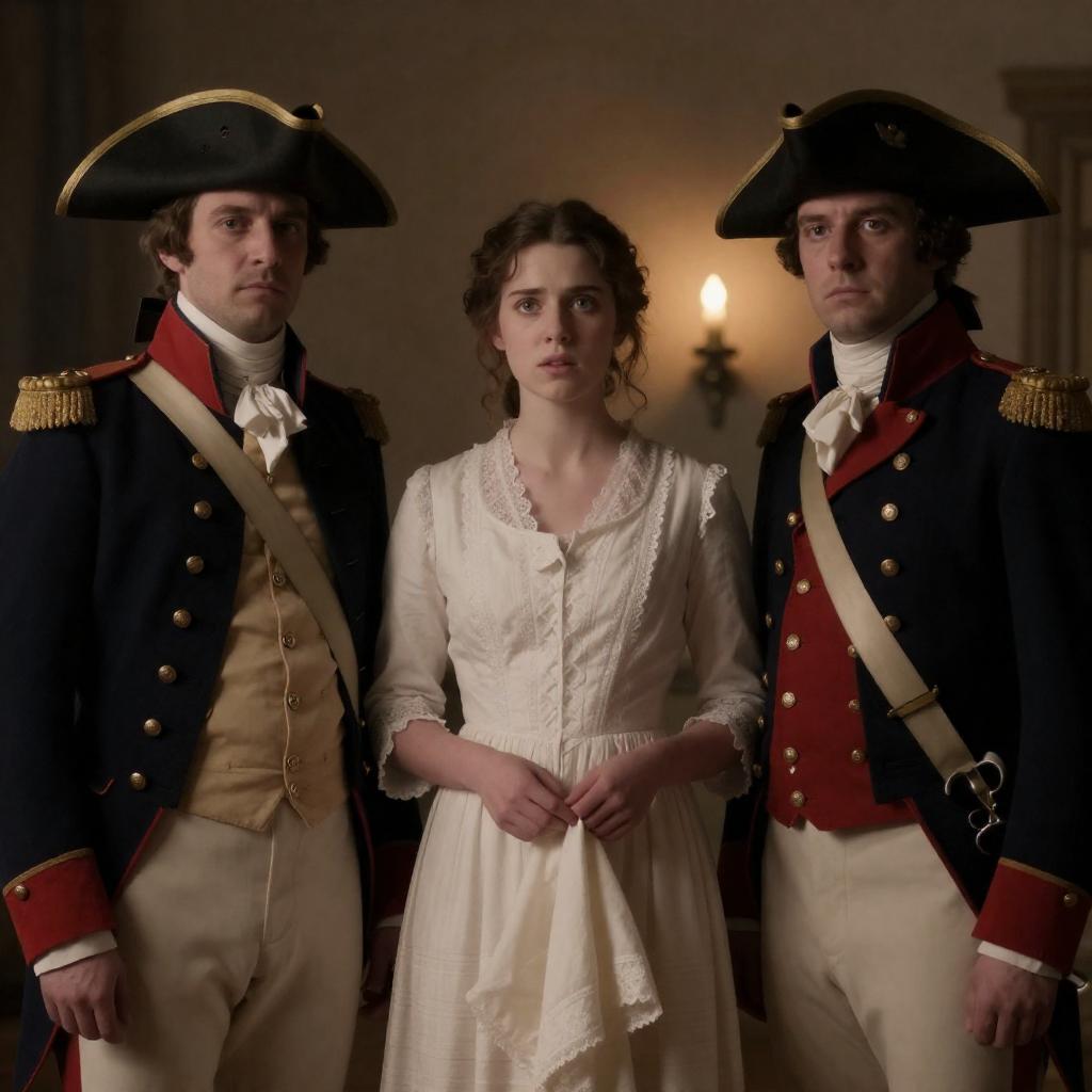 A vintage-style photograph shows three people in 18th-century attire. A woman in a dark dress sits on the left, a child in a white shirt, pink shorts, and a yellow bonnet stands in the center, and a man in a black suit sits on the right. They are in a dimly lit, ornate room with wooden furniture.