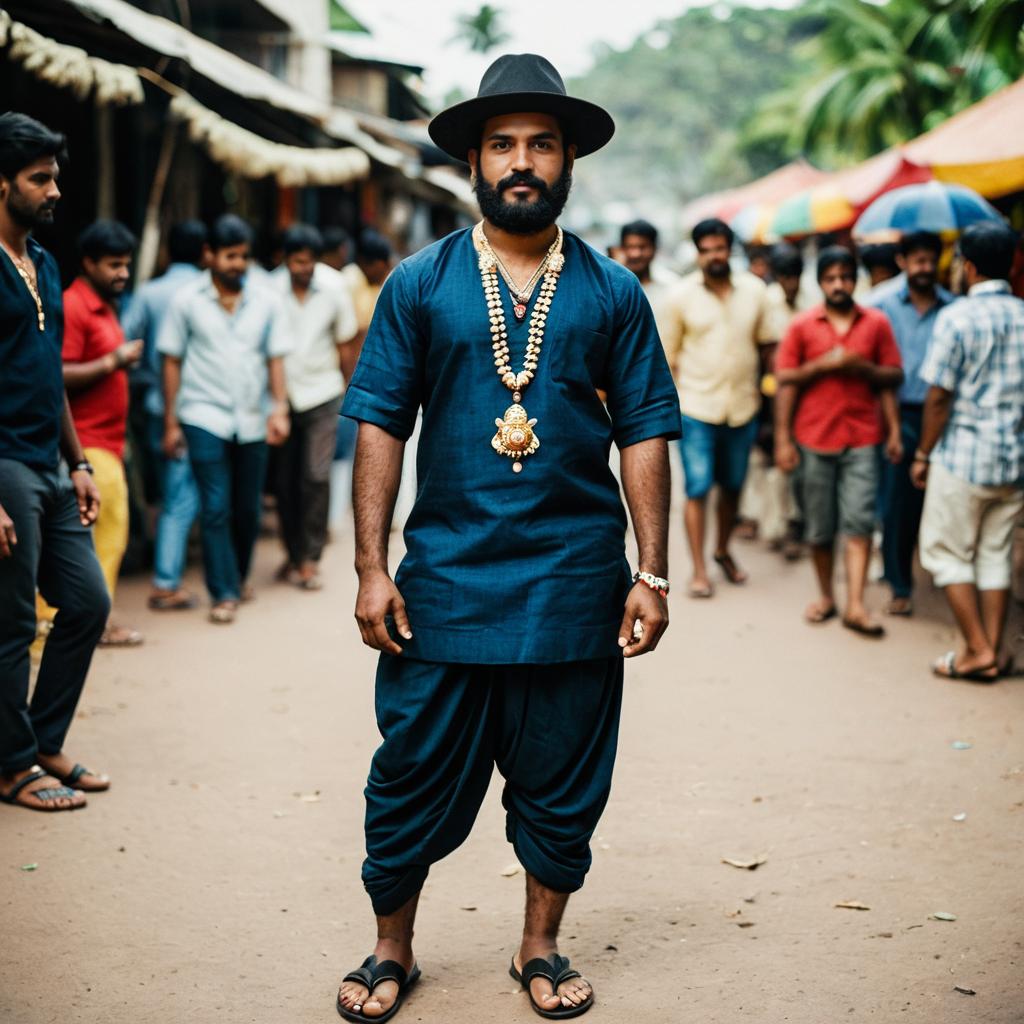 Vinayagar costume, 1boy, jewelry, male focus, necklace, facial hair, sandals, blurry, looking at viewer, blurry background, standing, solo focus, beard, mustache, dark skin, black hair, full body, hat