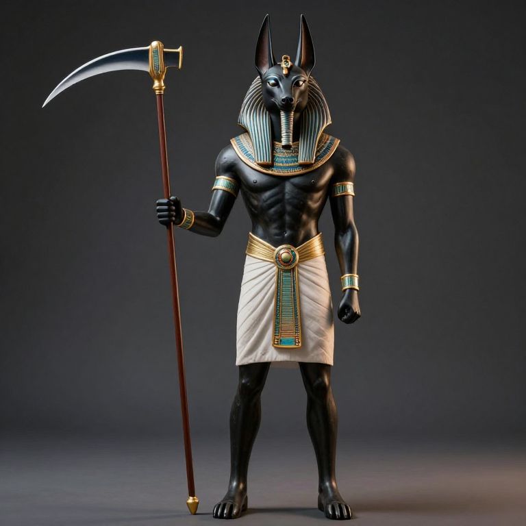 Anubis, the Egyptian god of the afterlife, is depicted in a photorealistic, cinematic light, holding a scythe, with a full body view.