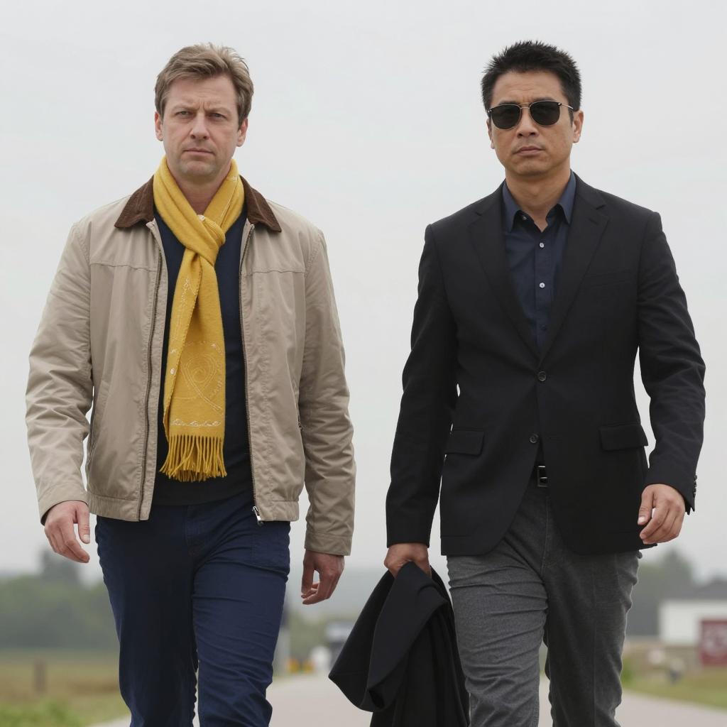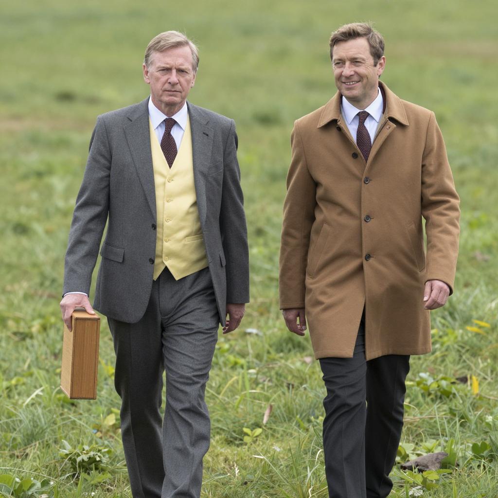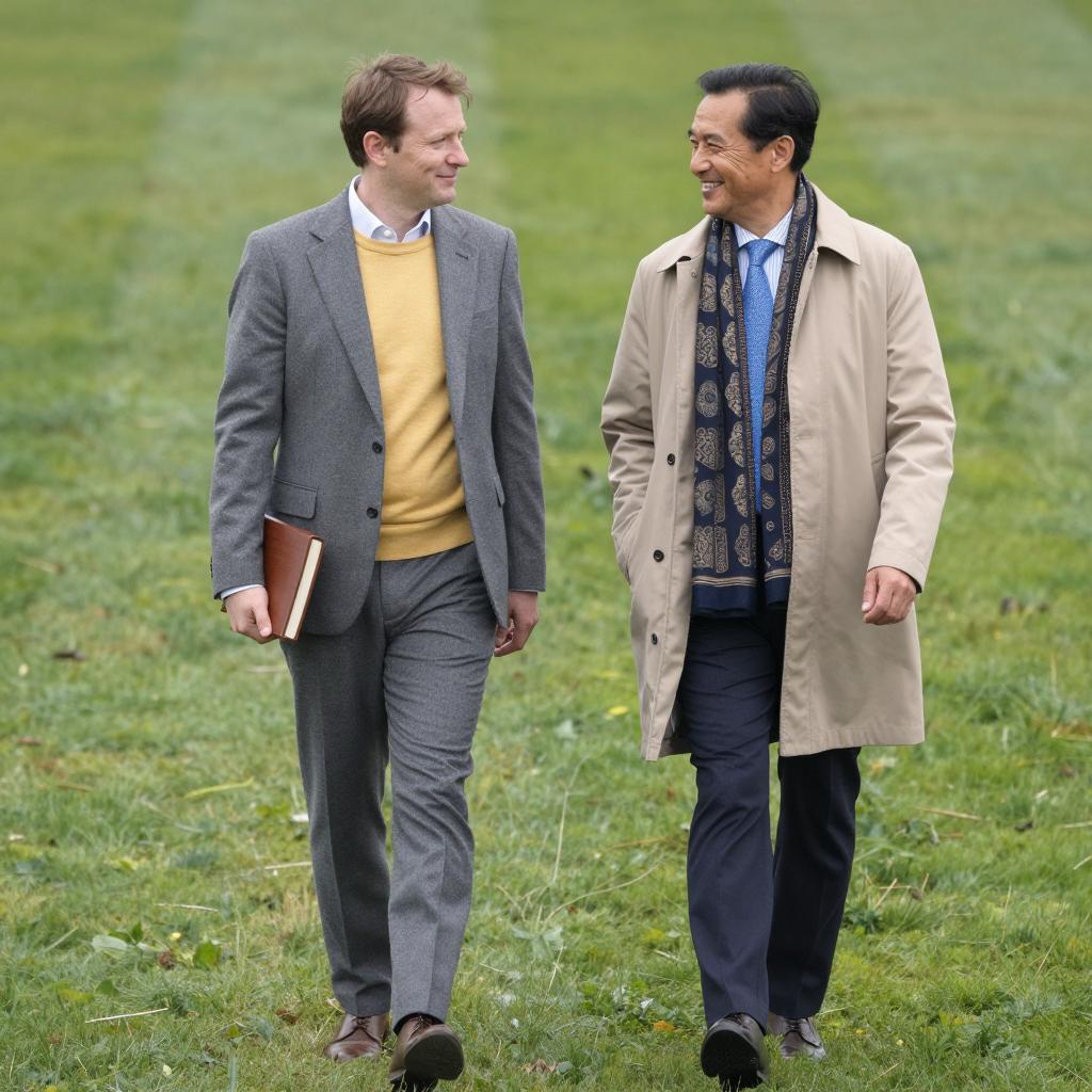 Photograph of two men walking in a green field. Both wear suits; left man in gray with yellow vest, right man in brown overcoat. Left man holds wooden box. Grass fills background. Left man has neutral expression, right man smiles.