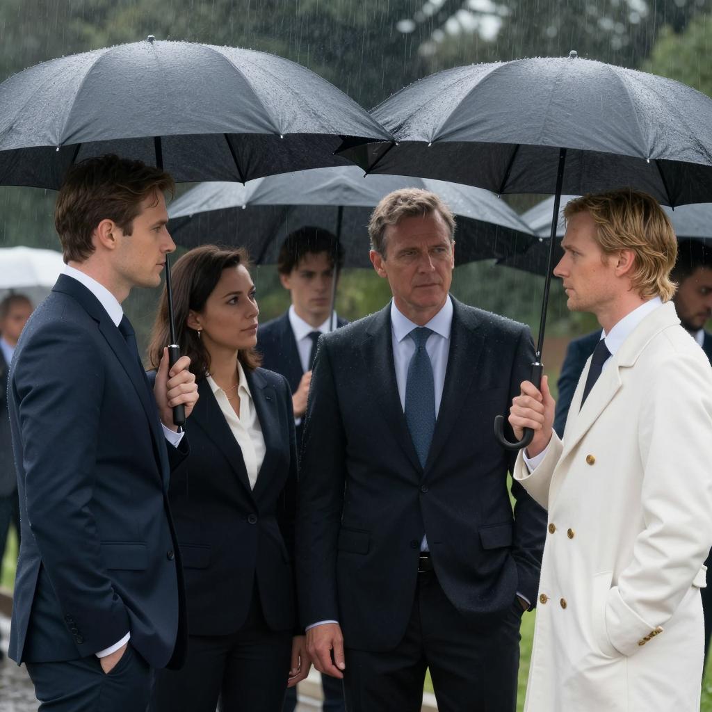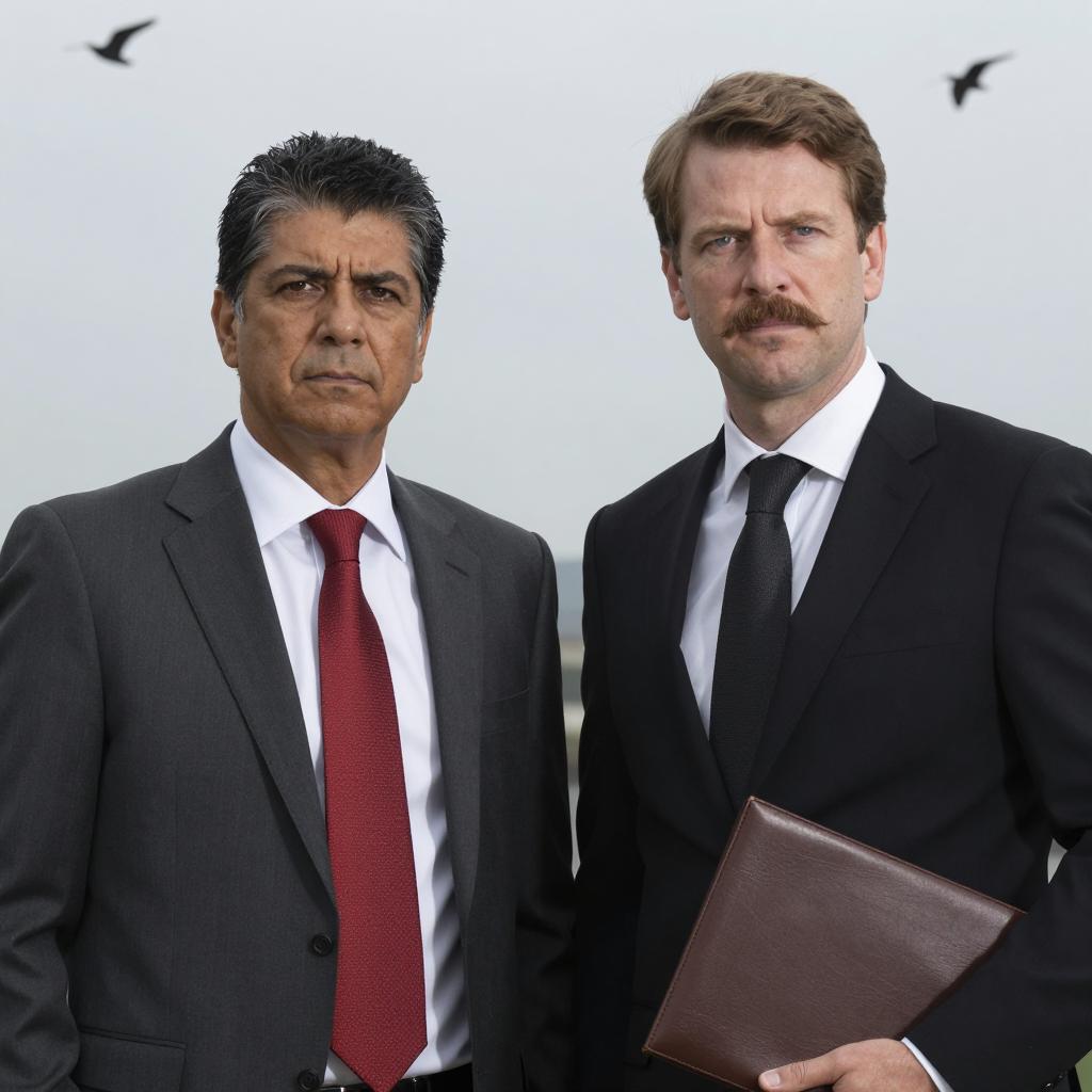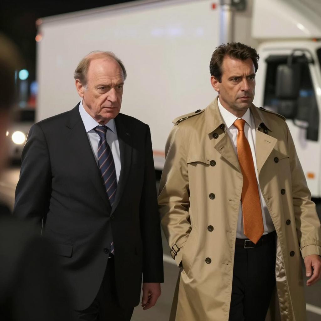 Photograph of two men walking in a green field. Both wear suits; left man in gray with yellow vest, right man in brown overcoat. Left man holds wooden box. Grass fills background. Left man has neutral expression, right man smiles.