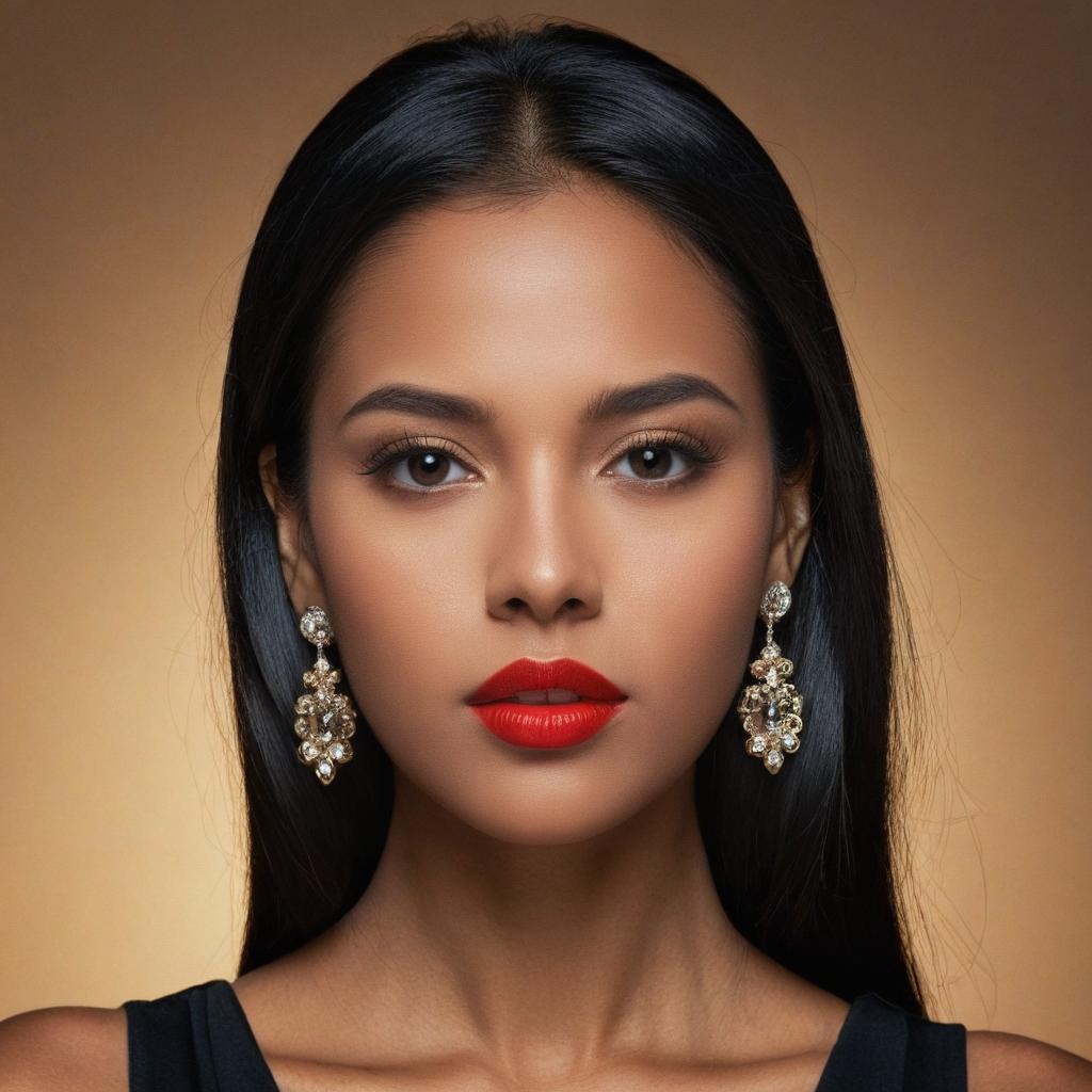 Close-up portrait of a dark-skinned woman with long black hair, wearing gold and diamond drop earrings. She has a smooth complexion with flawless makeup including red lipstick, subtle eyeshadow, and well-groomed eyebrows. The woman has brown eyes and a calm expression with a simple warm-toned background.