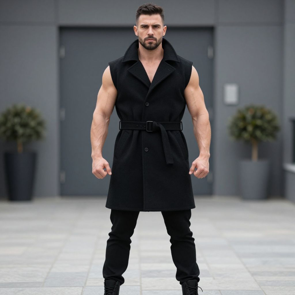 Photograph of a muscular man with dark, short hair and a trimmed beard, standing outdoors. He's wearing a sleeveless, black, knee-length coat with a belt, and black pants and boots. His arms are slightly flexed, and he has a serious expression. The background is a blurred, gray, modern building with a large door and a potted plant. The overall style is minimalist and edgy.