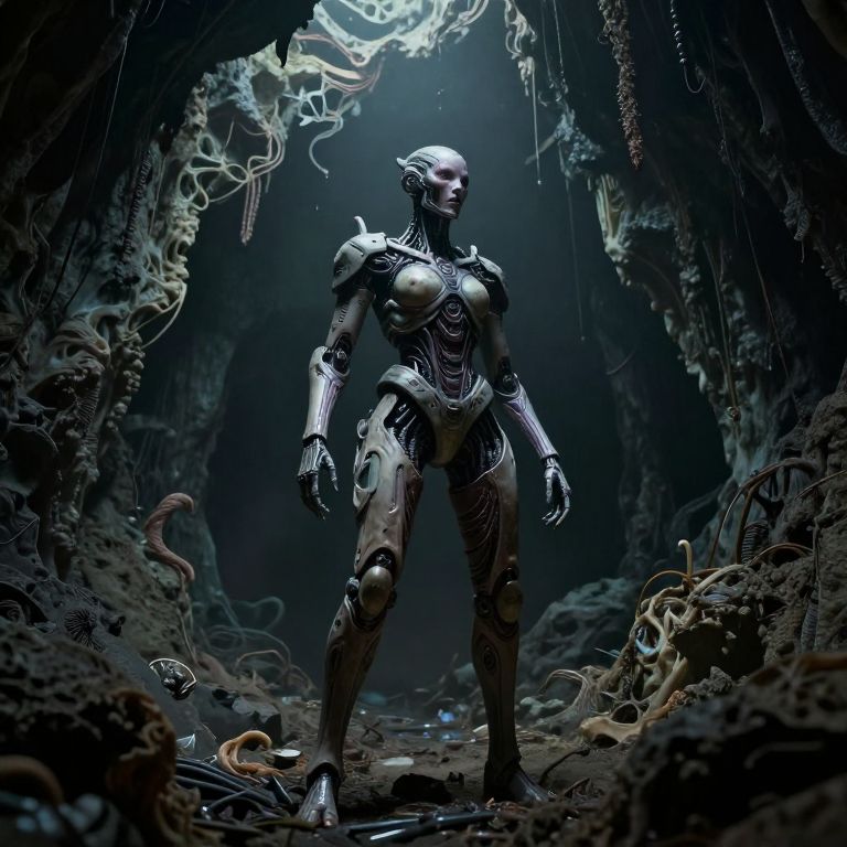 An enigmatic digital artwork that blends organic and mechanical elements in a vast, dark cavern, evoking an atmosphere of both fear and fascination. A cyber-organic warrior, her intricate biotech armor seamlessly fused with her biological form, stands alone at the scene's center. Captured from a 'bug's-eye view', this image combines science fiction horror with abstract surrealism to challenge our perception of life and technology, creating a striking visual narrative rich in detail and emotional depth.