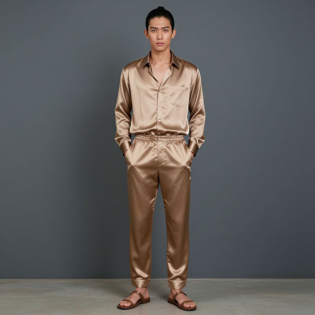 Photograph of an East Asian man standing against a solid dark blue background. He has short black hair and a neutral expression. He wears a shiny, metallic gold satin shirt with the top buttons undone, revealing a hint of his chest, and matching gold satin pants with an elastic waistband. His hands are in his pockets, and he stands in brown leather sandals. The lighting is even, highlighting the smooth, reflective texture of the satin fabric. The overall style is modern and minimalist.