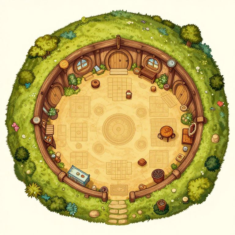 Dnd house map generator, cozy hobbit-like underground dwelling carved into a hill, lush garden outside, circular doors and windows, top-down illustrated map with furniture and floor patterns, warm earthy tones, hand-drawn fantasy RPG style, inviting and detailed