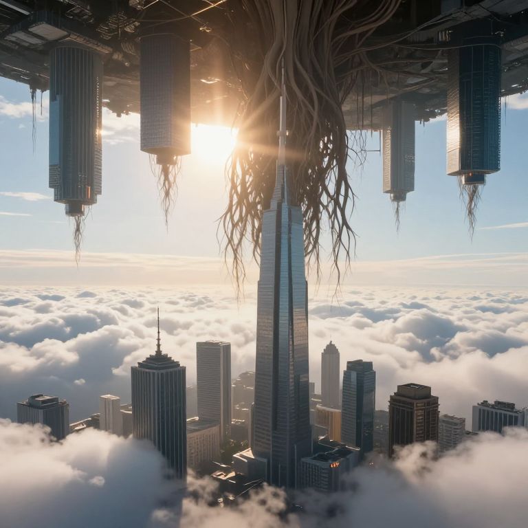 Surreal skyscrapers defy gravity, suspended in the heavens by cascading roots that plunge into a radiant sun, as clouds drift below this inverted metropolis where the horizon bends to the whims of imagination.
