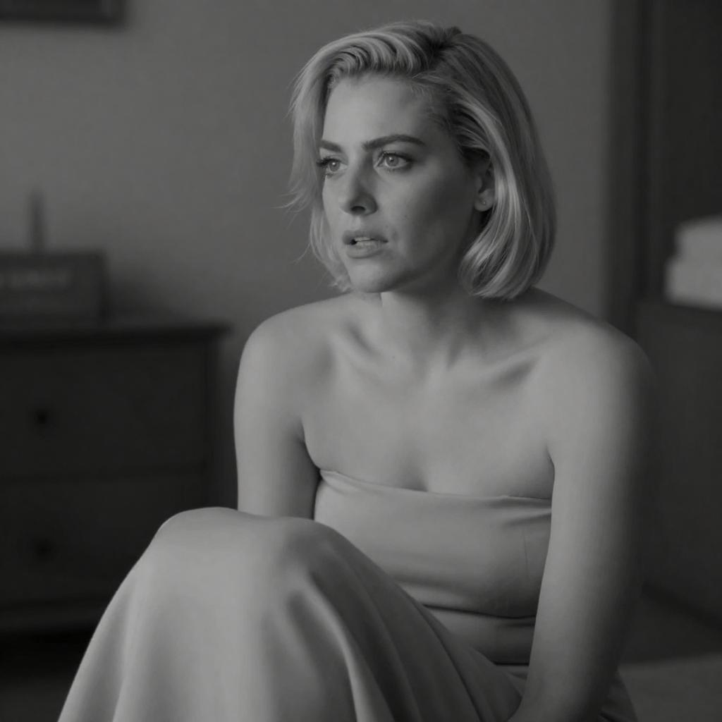 Black-and-white close-up portrait of a young blonde woman with short, styled hair wearing a strapless dress. She is seated with draped fabric in her lap, gazing thoughtfully to the left with a slightly open mouth. The blurred background features indoor furniture, giving an intimate and artistic atmosphere.