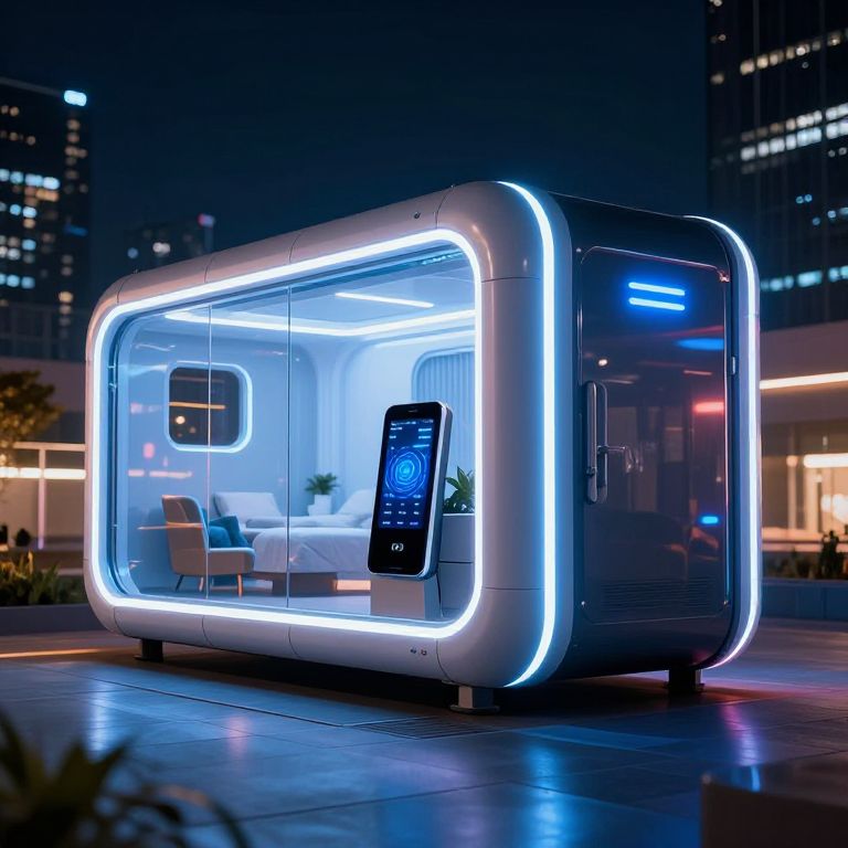 Photograph of a futuristic, glowing, compact, white, pod-like structure with rounded edges and neon blue lighting. The interior is brightly lit, revealing a modern, minimalist design with a small white couch, a potted plant, and a smartphone displaying a fingerprint scan interface mounted on the exterior. The background features a nighttime cityscape with tall buildings and illuminated windows, and the foreground has a reflective tiled surface. The overall aesthetic is high-tech and futuristic, with a sleek, modern, and clean look.