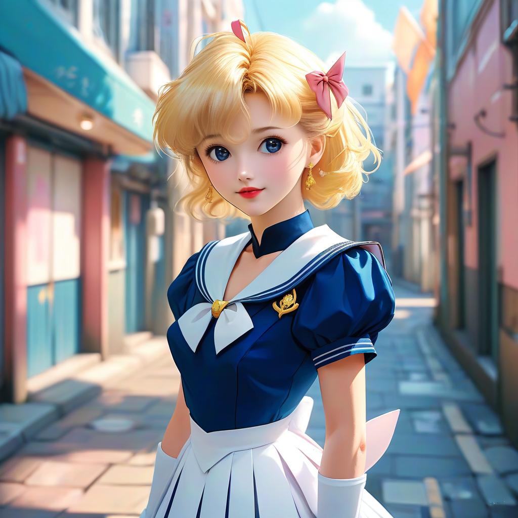 (best quality:1.1), (masterpiece:1.4), (absurdres:1.0), portrait, close-up, 1girl, sailor uranus, KizukiAi, mature woman, small breasts, aqua eyes, blonde hair, sailor senshi uniform, sailor collar, chest bow, back bow, plead skirt, white elbow gloves, city, street, alley, (blush:1.2), looking at viewer, (smile:1.2)