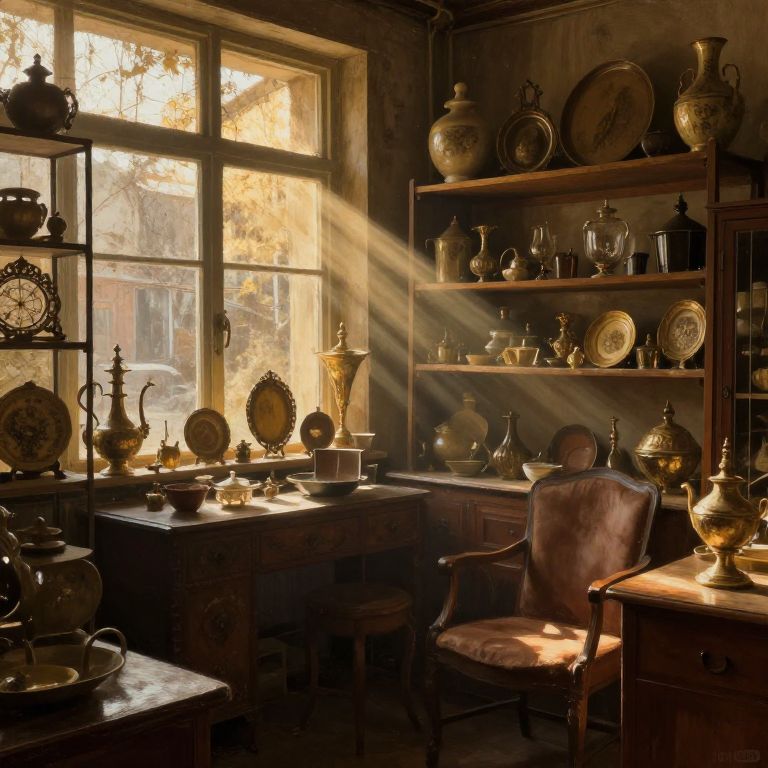 Vintage emporium interior filled with antique furniture, shelves stacked with ornate trinkets, golden rays of light filtering through dusty windows, nostalgic mood, painterly style with warm earthy tones